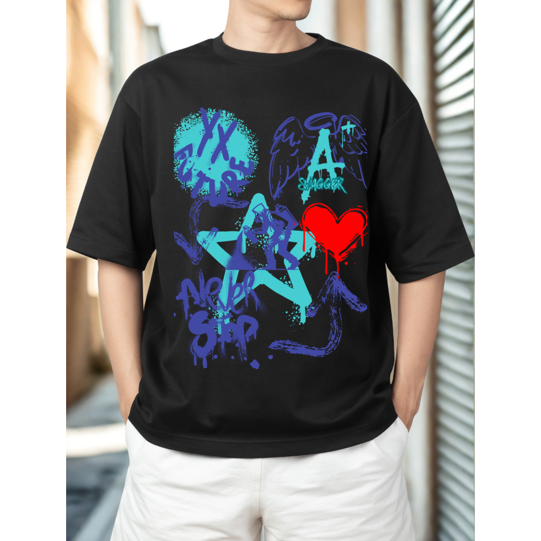Make a bold statement with this oversized shirt featuring our exclusive A Plus Swagger design. This premium tee combines street art aesthetics with comfort, showcasing vibrant turquoise and purple graphics including graffiti-style lettering, an angel motif, and a striking red heart.